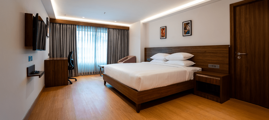 Lilac Hotels, Guruvayur features a range of thoughtfully designed rooms and suites to accommodate families and guests attending weddings, allowing everyone to stay together with ease. Ample parking facilities make arrivals and departures smooth, particularly on busy wedding days.
